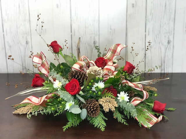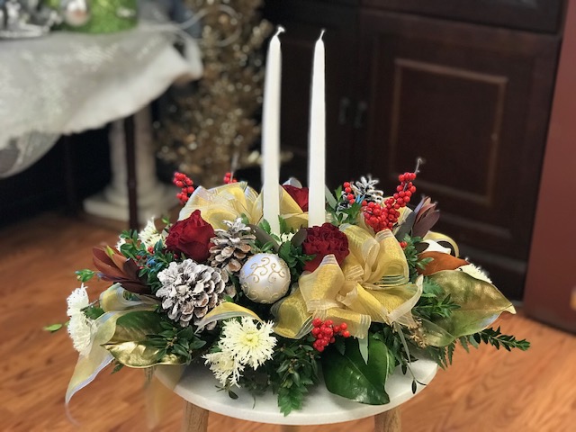 A centerpiece design using optional candles, winter greens, festive flowers, dried elements, and holiday decorations. Please specify in the “Order Notes” field at checkout if you would like us to include candles!