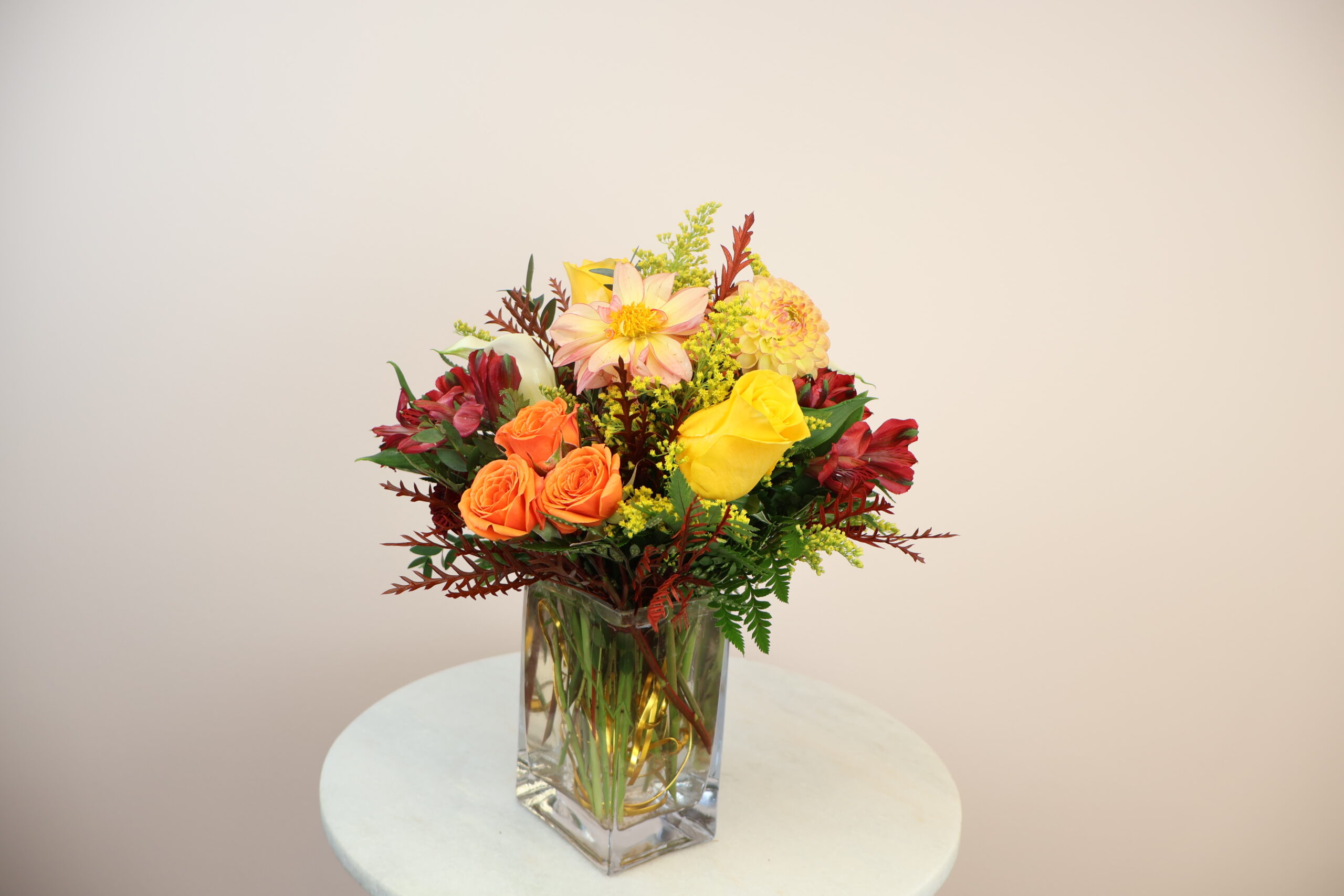A sophisticated autumn colored design of seasonal flowers such as roses, calla lilies, gerbera daisies, dahlias, alstromeria, and snap dragons with decorative wire and or branches.