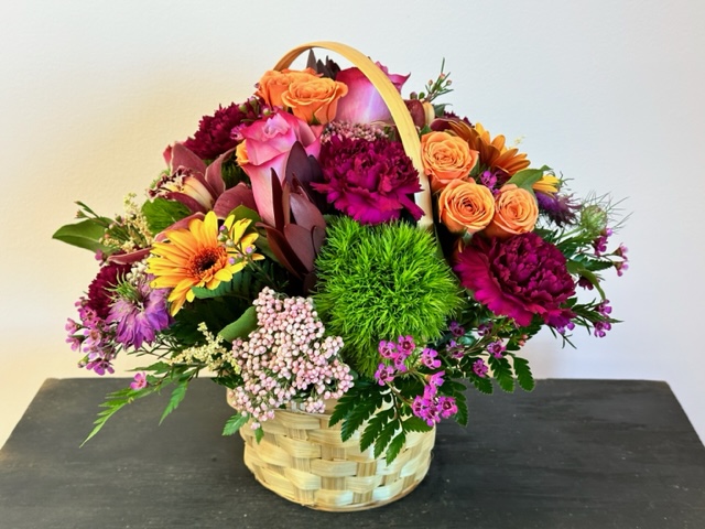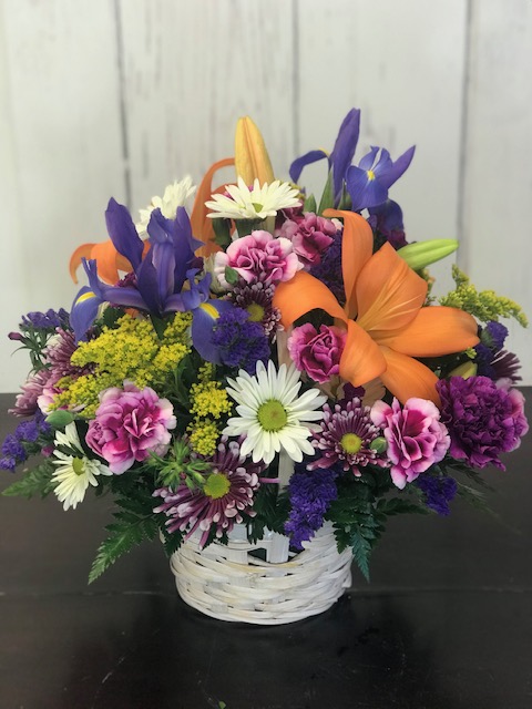 A cheerful basket arrangement of vibrant colors using seasonal flowers such as lilies, irises, daisies, tulips, carnations, mums, roses, and solidago.