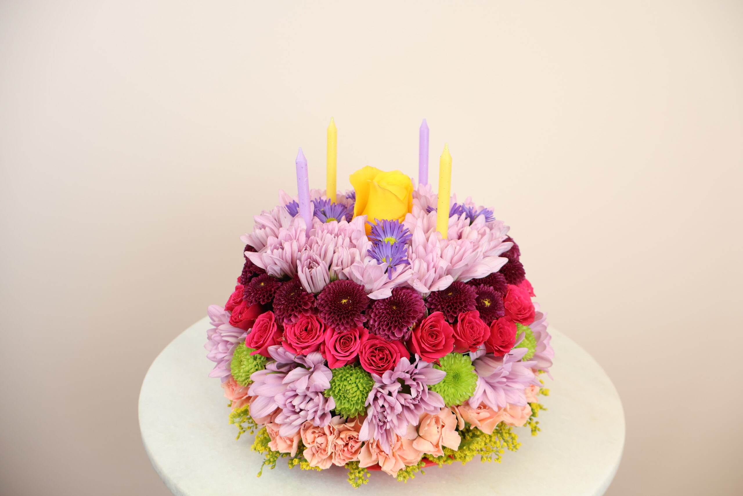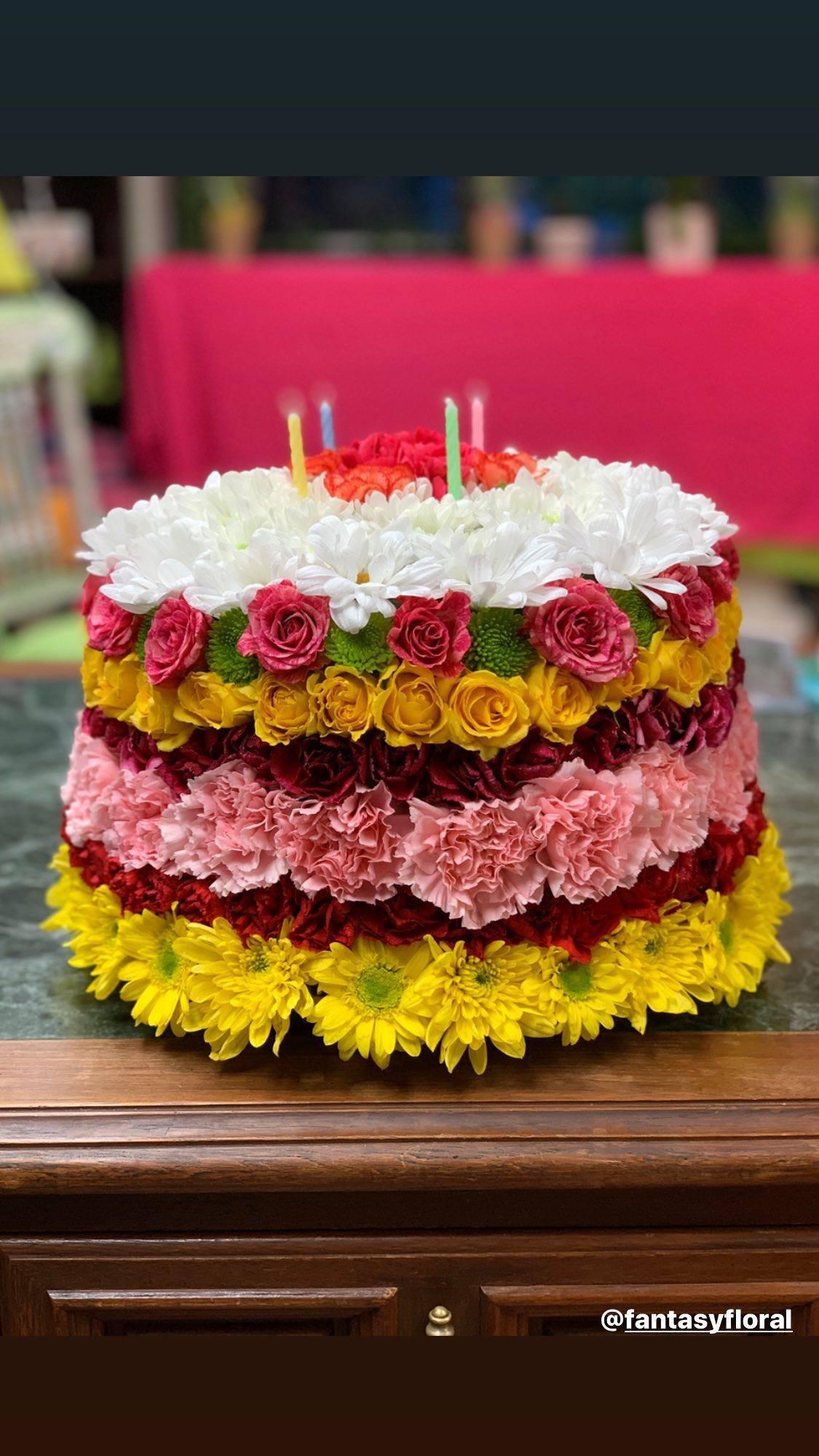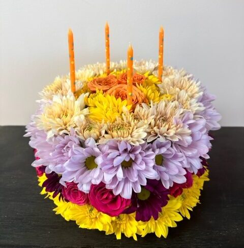 A fun and brilliant design of fresh colorful flowers in the form of a birthday cake. Each cake is unique in colors and flowers!