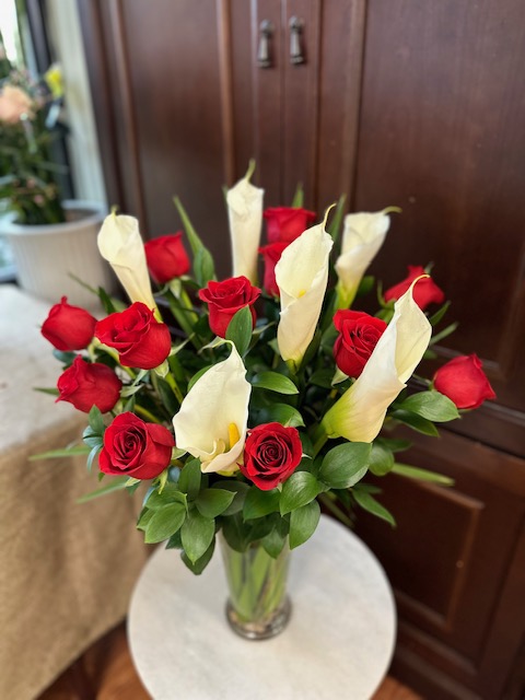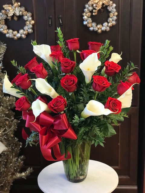 An elegant design of large open cut white calla lilies and red roses with fancy greens.