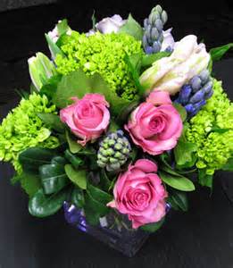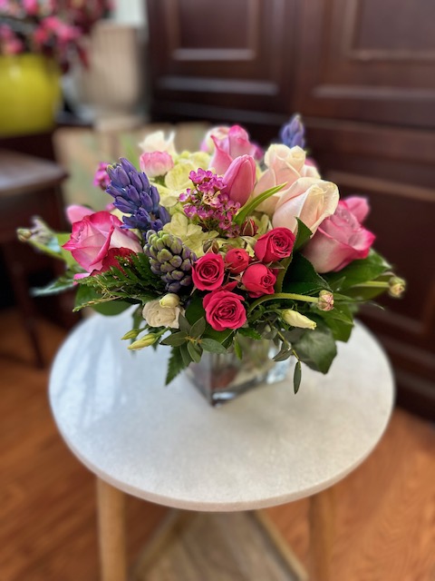 A precious arrangement of greens, purples, and pinks using seasonal flowers such as hydrangeas, tulips, roses, delphinium, hyacinth, lisianthus, and statice with assorted greens.