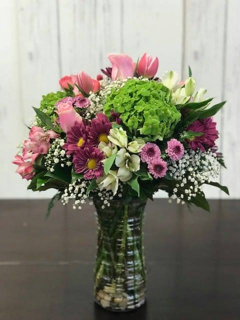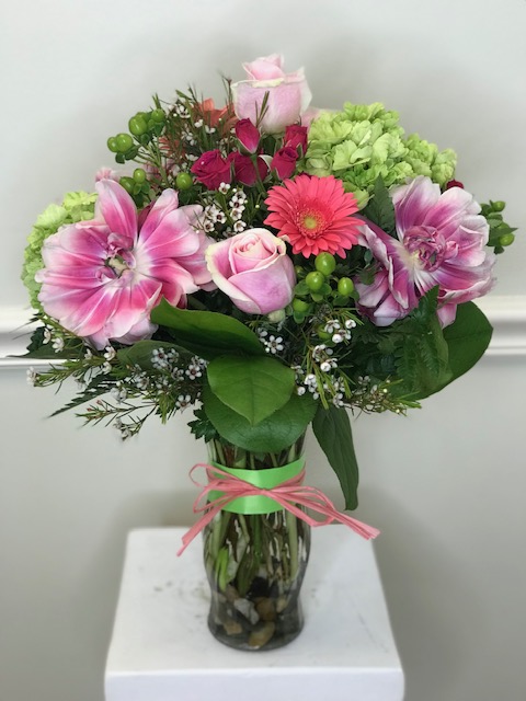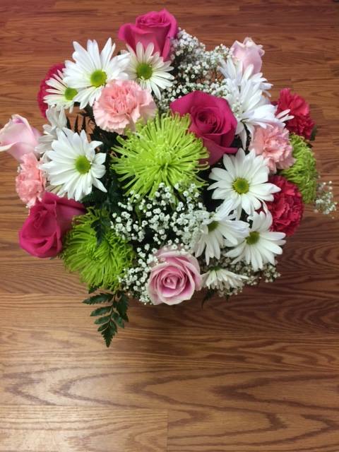A delightful design of pinks and greens using seasonal flowers such as roses, daisies, asters, sweet william, carnations, and filler.