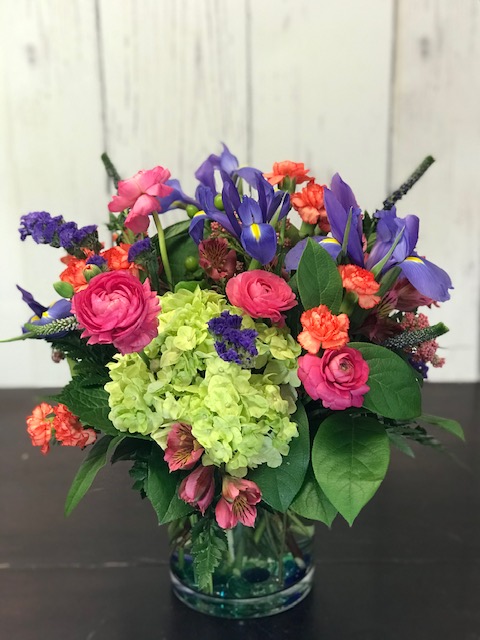 A cheery design of purples, hot pinks, and oranges using seasonal flowers such as irises, roses, hydrangeas, carnations, and mums.