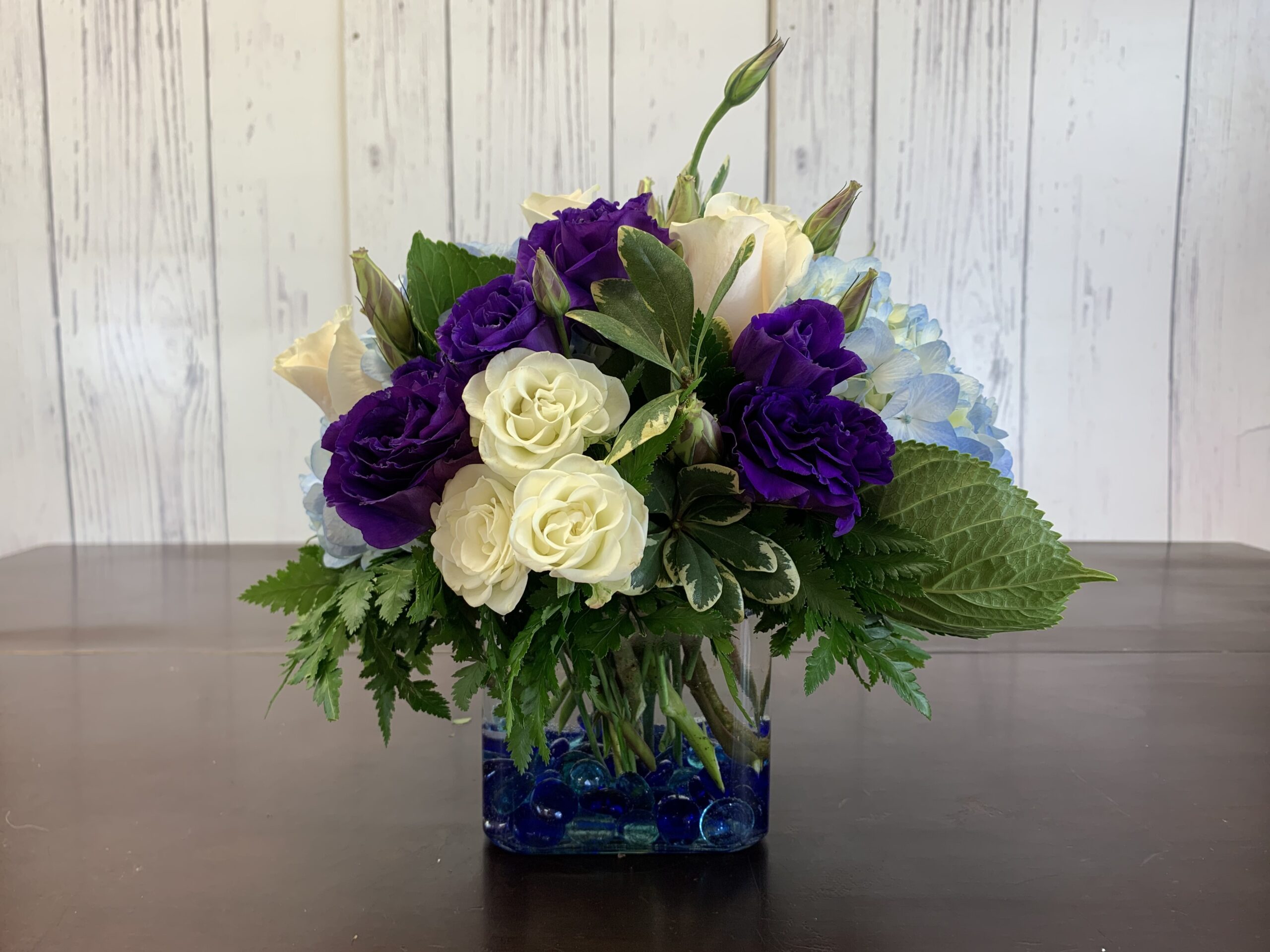 Refreshing blues, purples, and whites with hydrangeas, roses, and seasonal flowers such as iris, lisianthus, and stock in a short compact modern style.