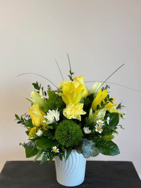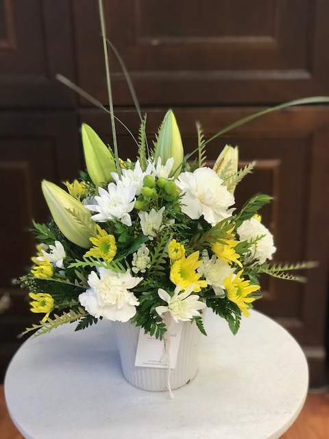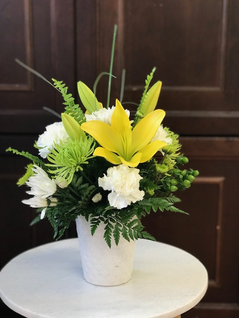 A peaceful arrangement with yellows, whites, and soft greens comprised of seasonal flowers such as lilies, carnations, spider mums, filler and greenery.