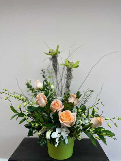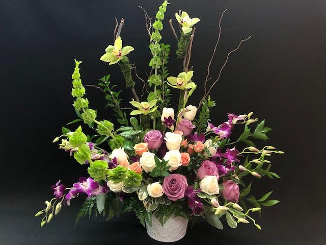 A designer’s choice contemporary piece using flowers that lend a modern tropical look such as cymbidium orchids, roses, dendrobium orchids, snap dragons, or other linear flowers/greenery, and decorated with curly willow branches, and elegant greens.