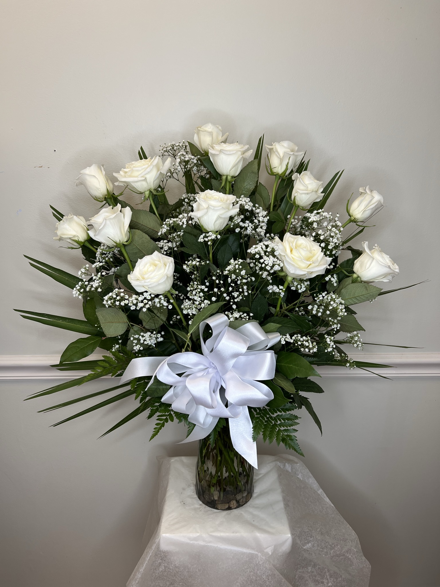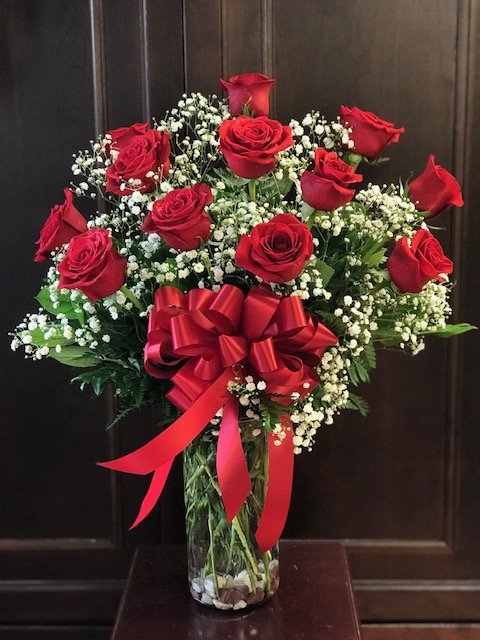 Long stem roses arranged traditionally in a vase–symmetrically tiered with baby’s breath and standard greenery. Just choose the number of roses and the color of roses you would like!
