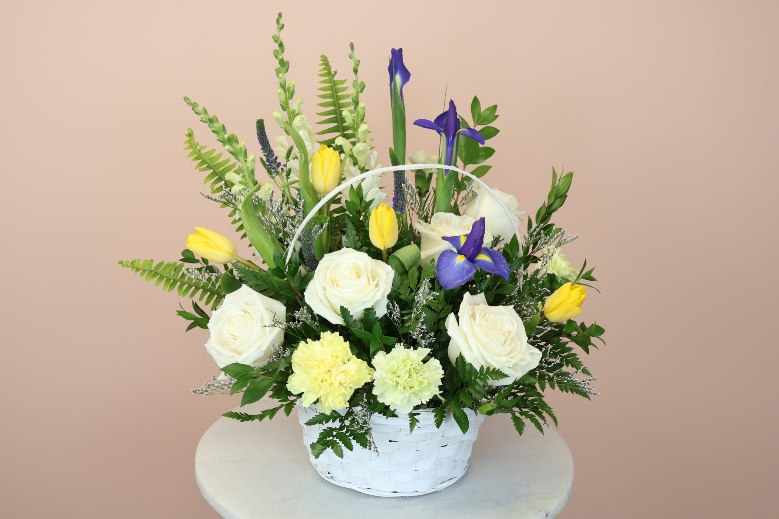 A lovely basket of purples, pale yellows, and whites using seasonal flowers such as irises, roses, carnations, tulips, delphinium, snap dragons, veronica, and statice with elegant greens.