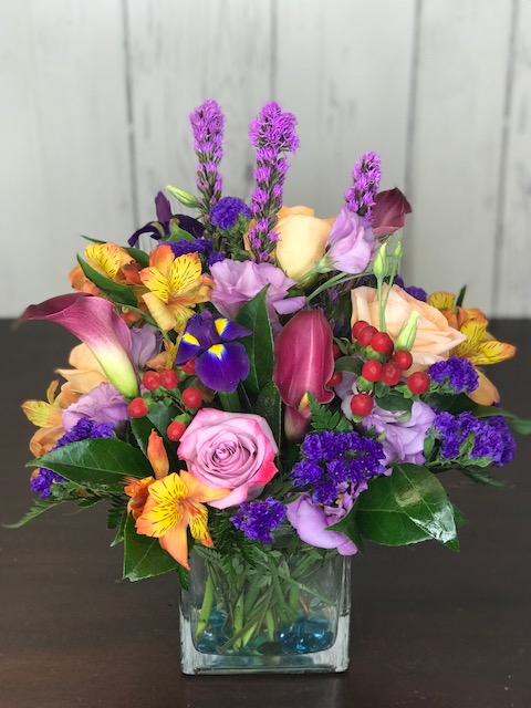 A bright design of oranges, hot pinks, and purples using seasonal flowers such as calla lilies, liatris, roses, berries, and asiatic lilies.