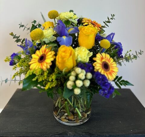 A vibrant arrangement of yellows and purples consisting of seasonal flowers such as roses, irises, daisies, mums, and statice with fresh smelling eucalyptus.