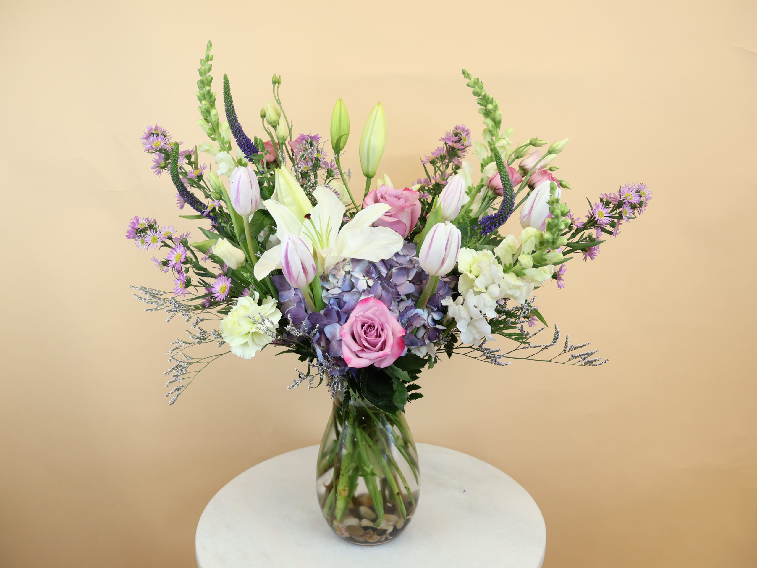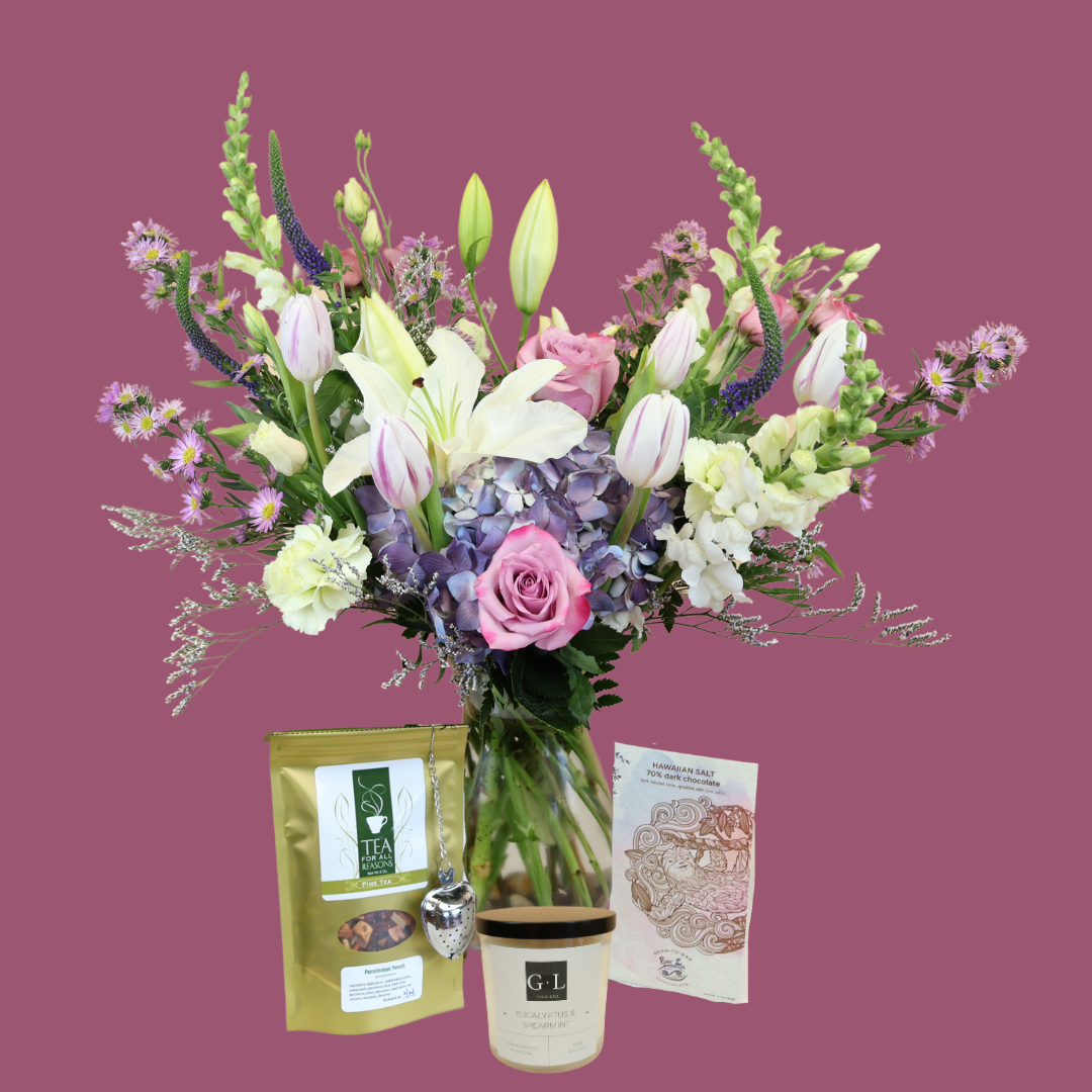 Designer’s Choice arrangement in lovely colors of pinks, purples, and blues, accompanied by a gift bag with artisanal chocolate, loose leaf leaf tea with a heart-shaped tea infuser, and a scented candle. All provided by local family-owned businesses!
