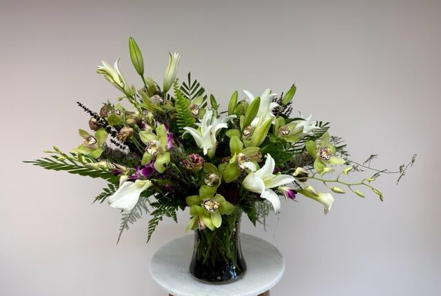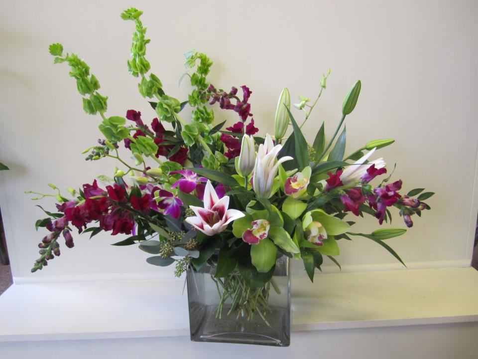 A contemporary and elegant design of purples and greens using seasonal flowers such as bells of Ireland, snapdragons, lilies, orchids, roses, and elegant greenery.